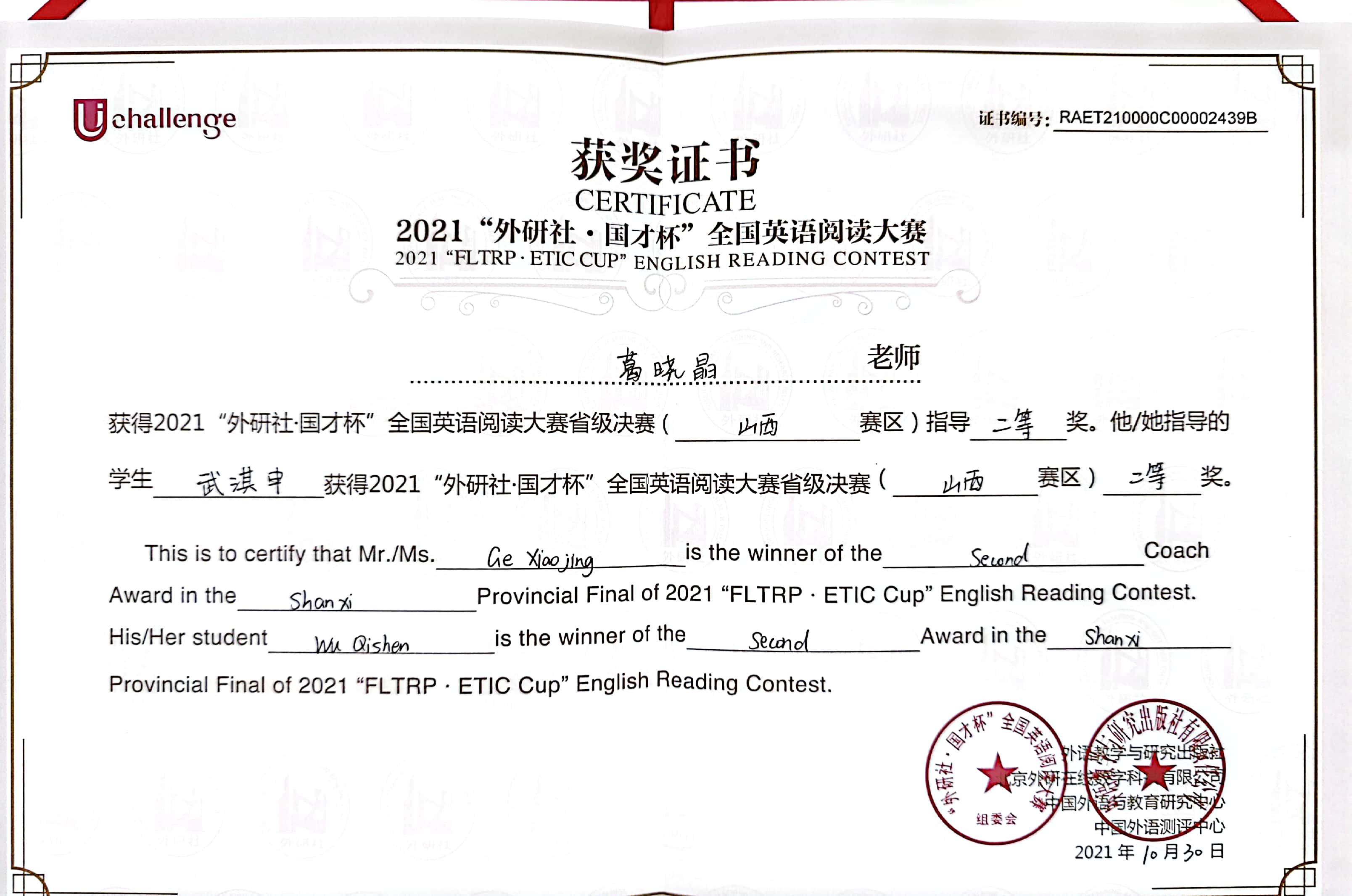 10月,葛晓晶老师荣获2021外研社·国才杯英语阅读大赛省级决赛指导二等奖;张玉洁老师荣获2021外研社·国才杯英语阅读大赛省级决赛指导三等奖;白玲玲老师荣获2021外研社·国才杯英语写作大赛省级决赛指导三等奖;