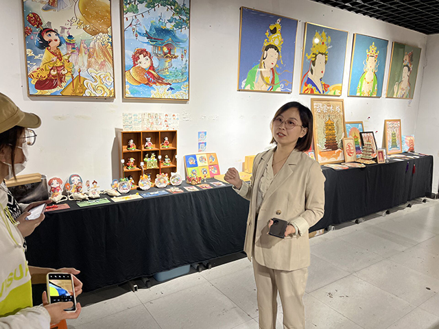 学院各个专业的学生展览品体现了应用性与艺术性的完美结合,丰富的陈列内容深深的吸引了同学们。展厅以丰富的现代展示思维和传统的陈列方式相结合,使学生穿梭于古今之间,与古人进行跨越时空的交流。整个过程大家都感受到了文化的感染和熏陶,展厅气氛十分活跃,这也加深了师生之间的互相了解。在活动现场,闫晓英老师还会与同学们进行互动,将优秀的作品设计理念介绍给大家;把生动形象的古风表情包设计分享给大家;以多种多样的形式让同学们去感受展厅非遗文化的魅力,以及优秀作品的独特之处。